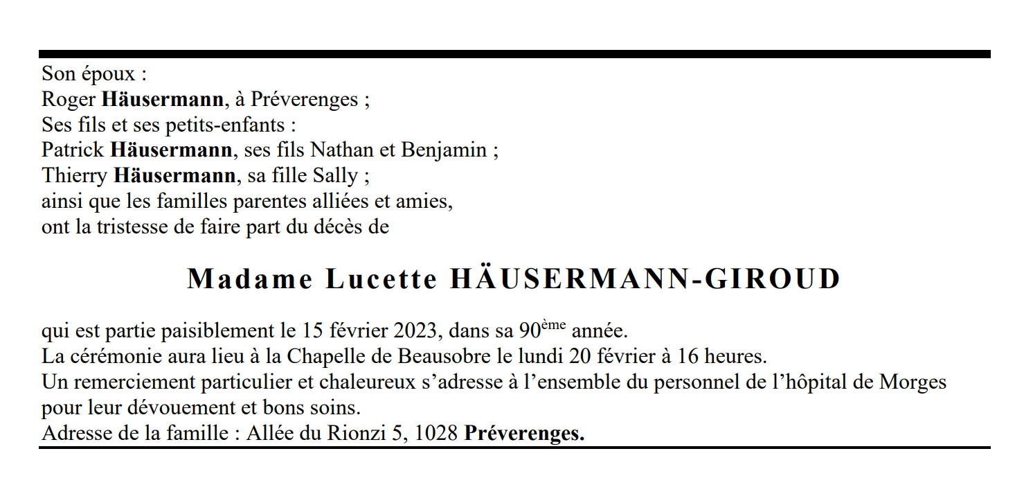 Madame Lucette HÄUSERMANN-GIROUD 22 juin. 1933 - 15 fév. 2023 Avis mortuaire PFG Télecharger PDF Partager sur: Galerie PreviousNext PreviousNext
