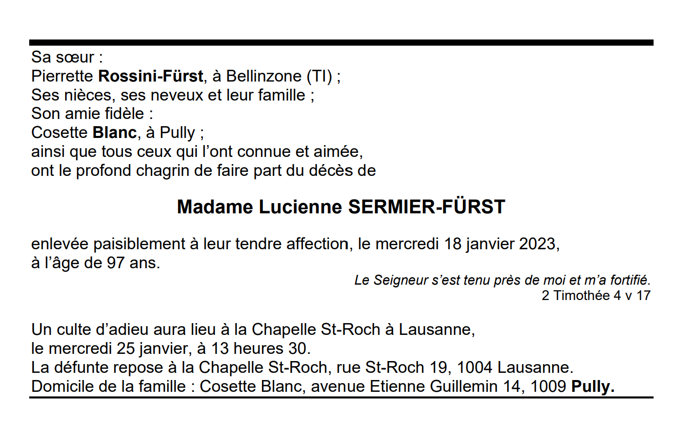 Madame Lucienne SERMIER-FÜRST 28 déc. 1925 - 18 jan. 2023 Avis mortuaire PFG Télecharger PDF Partager sur: Galerie PreviousNext PreviousNext