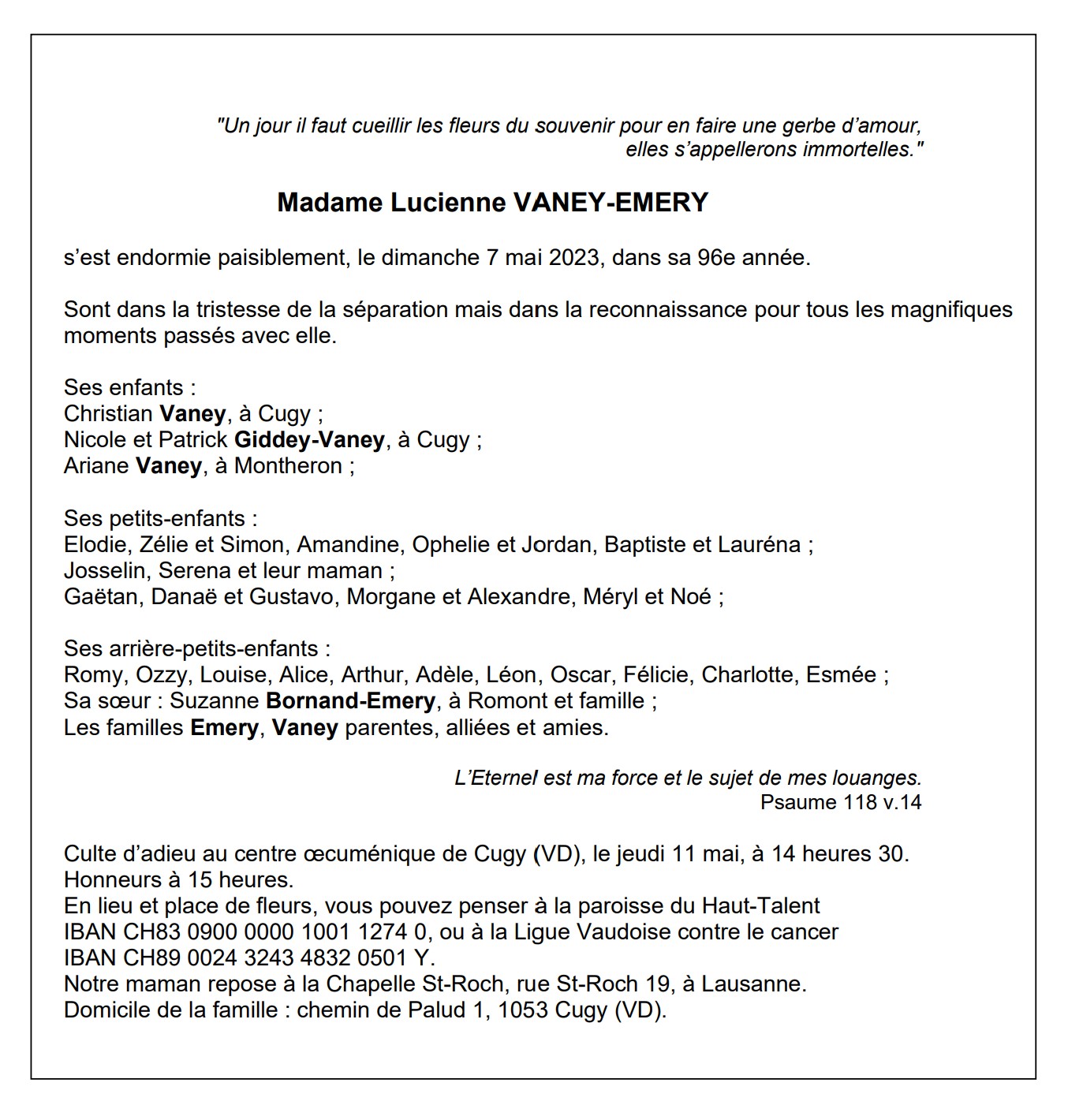 Madame Lucienne VANEY-EMERY 22 sep. 1927 - 07 mai. 2023 Avis mortuaire PFG Télecharger PDF Partager sur: Galerie PreviousNext PreviousNext