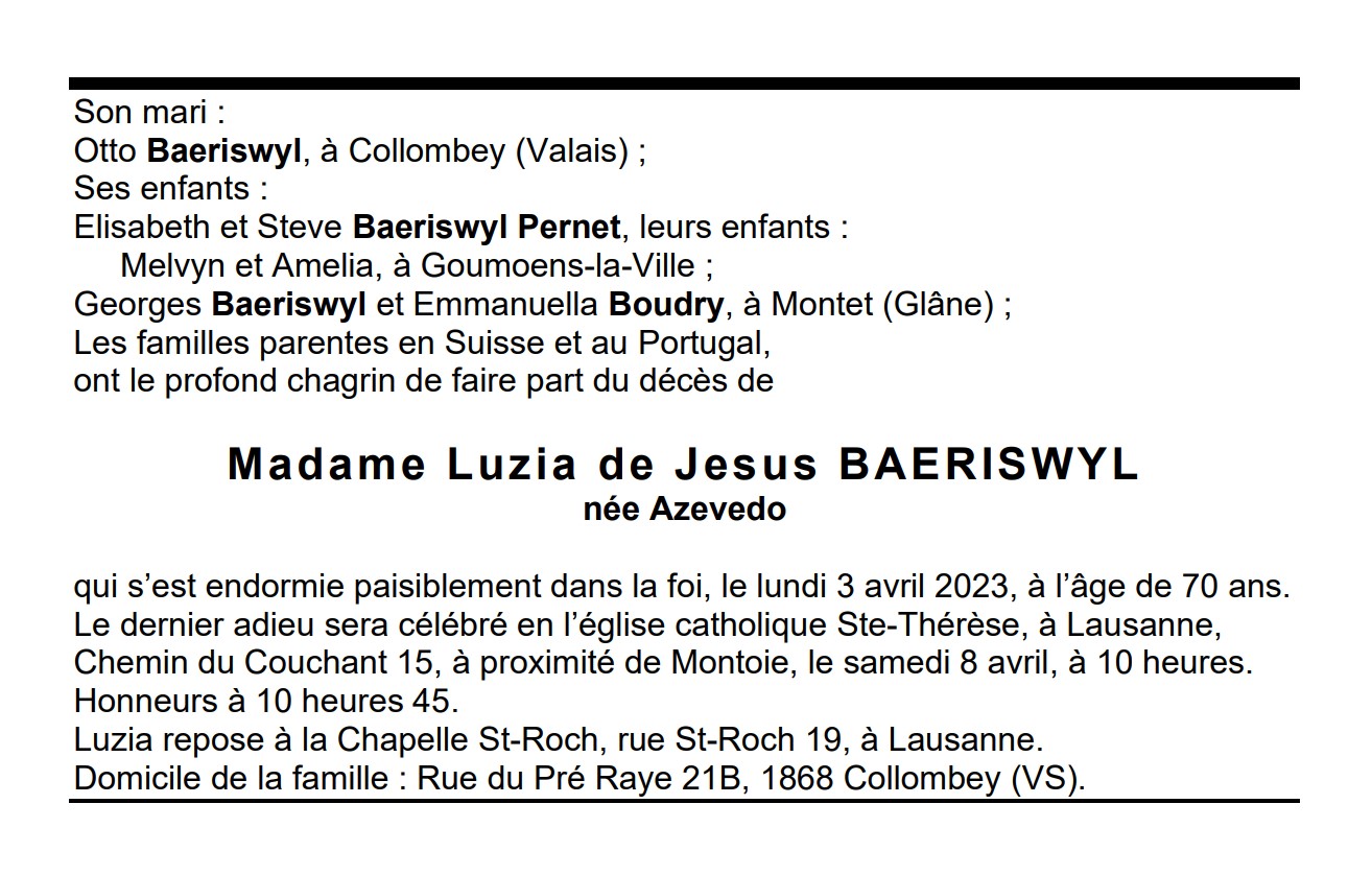 Madame Luzia de Jesus BAERISWYL 05 jan. 1953 - 03 avr. 2023 Avis mortuaire PFG Télecharger PDF Partager sur: Galerie PreviousNext PreviousNext