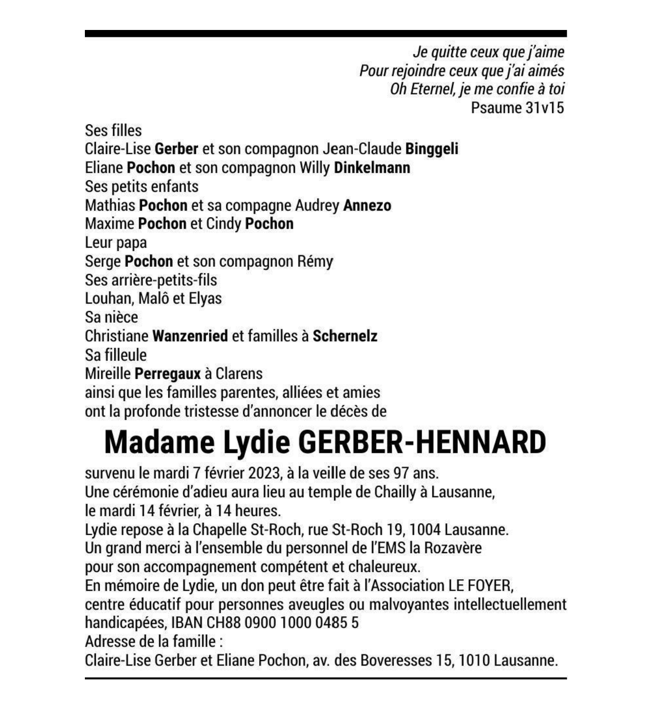 Madame Lydie GERBER-HENNARD 08 mar. 1926 - 07 fév. 2023 Avis mortuaire PFG Télecharger PDF Partager sur: Galerie PreviousNext PreviousNext
