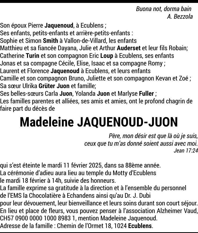 Madame Madeleine JACQUENOUD-JUON 10 mar. 1937 - 11 fév. 2025 Avis mortuaire PFG Partager sur: Galerie