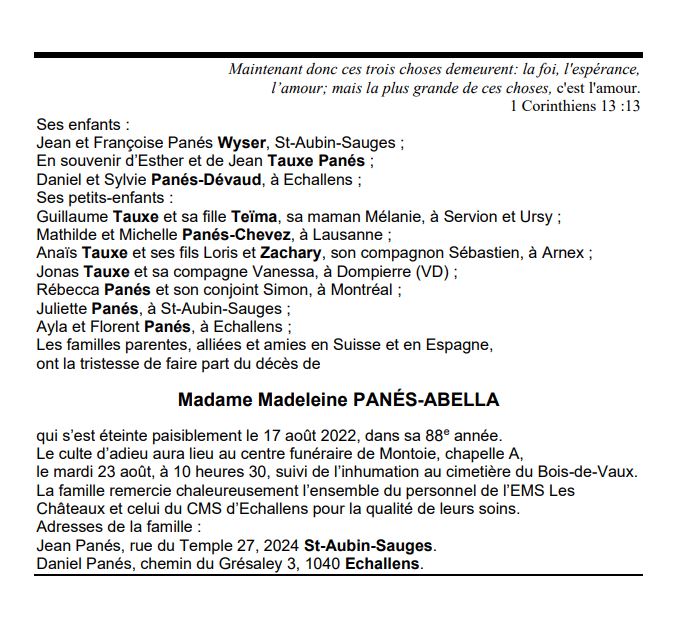 Madame Madeleine PANÉS-ABELLA 22 juil. 1935 - 17 aoû. 2022 Avis mortuaire PFG Télecharger PDF Partager sur: Galerie PreviousNext PreviousNext