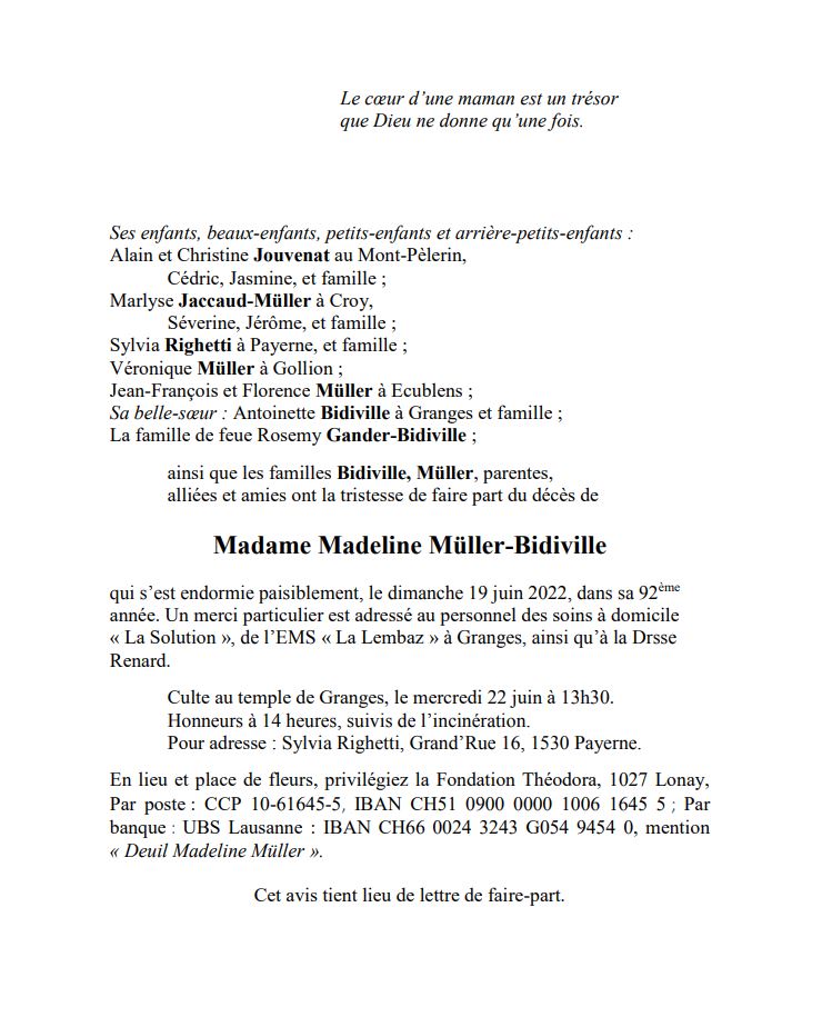 Madame Madeline Müller-Bidiville 17 mar. 1931 - 19 juin. 2022 Avis mortuaire PFG Télecharger PDF Partager sur: Galerie PreviousNext PreviousNext
