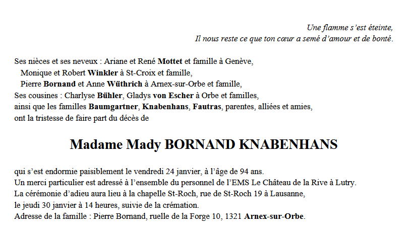 Madame Mady BORNAND KNABENHANS 26 nov. 1930 - 24 jan. 2025 Avis mortuaire PFG Télecharger PDF Partager sur: Galerie