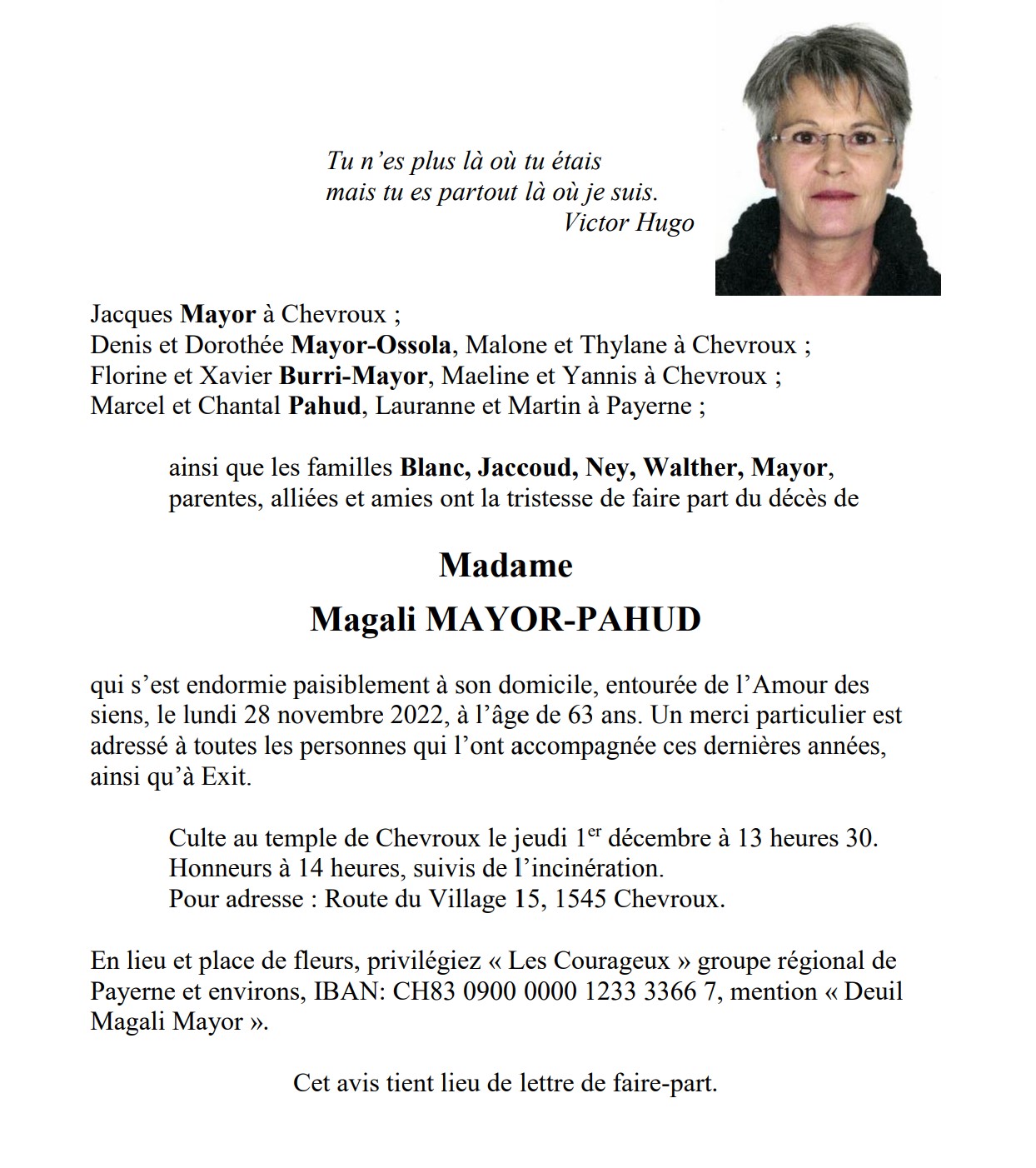 Madame Magali MAYOR-PAHUD 16 nov. 1959 - 28 nov. 2022 Avis mortuaire PFG Télecharger PDF Partager sur: Galerie PreviousNext PreviousNext