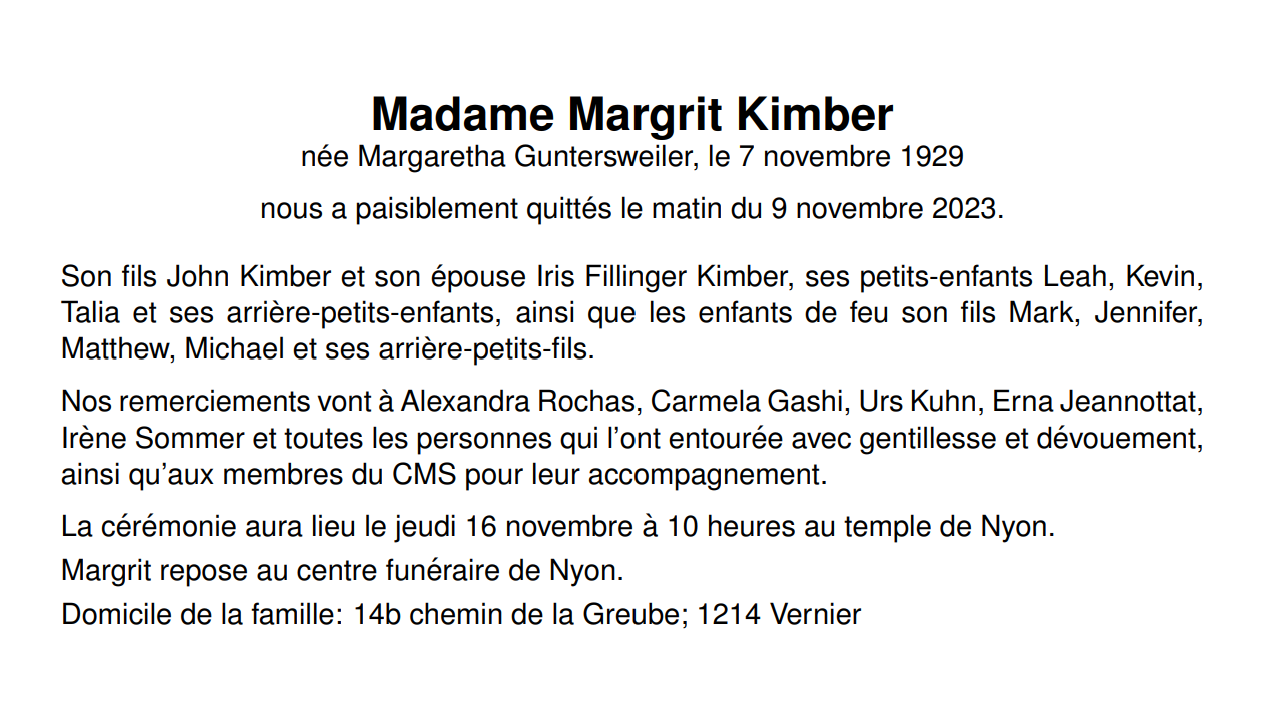 Madame Margrit Kimber, née Margaretha Guntersweiler 07 nov. 1929 - 09 nov. 2023 Avis mortuaire PFG Télecharger PDF Partager sur: Galerie PreviousNext PreviousNext