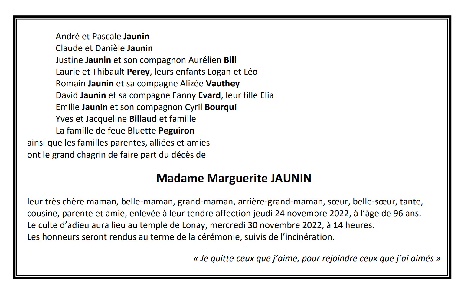 Madame Marguerite JAUNIN 30 jan. 1926 - 24 nov. 2022 Avis mortuaire PFG Télecharger PDF Partager sur: Galerie PreviousNext PreviousNext