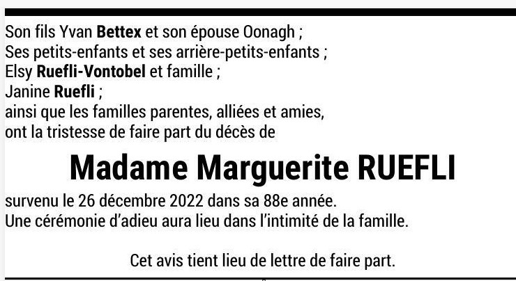 Madame Marguerite RUEFLI 11 jan. 1935 - 26 déc. 2022 Avis mortuaire PFG Télecharger PDF Partager sur: Galerie PreviousNext PreviousNext