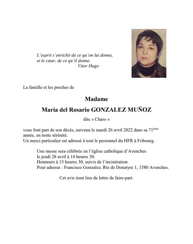 Madame Maria del Rosario GONZALEZ MUN᷉OZ 09 nov. 1951 - 26 avr. 2022 Avis mortuaire PFG Télecharger PDF Partager sur: Galerie PreviousNext PreviousNext
