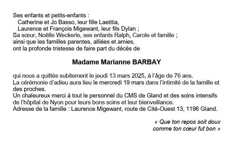 Madame Marianne BARBAY 24 fév. 1949 - 13 mar. 2025 Avis mortuaire PFG Télecharger PDF Partager sur: Galerie