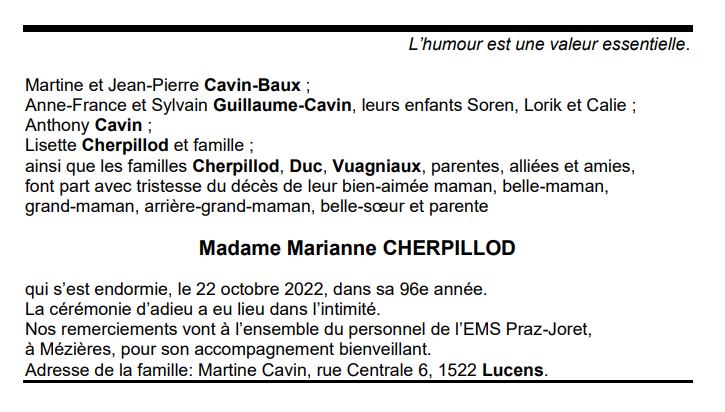 Madame Marianne CHERPILLOD 16 sep. 1927 - 22 oct. 2022 Avis mortuaire PFG Télecharger PDF Partager sur: Galerie PreviousNext PreviousNext