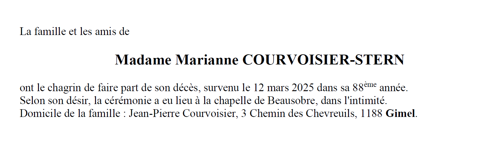 Madame Marianne COURVOISIER-STERN 09 déc. 1937 - 12 mar. 2025 Avis mortuaire PFG Télecharger PDF Partager sur: Galerie