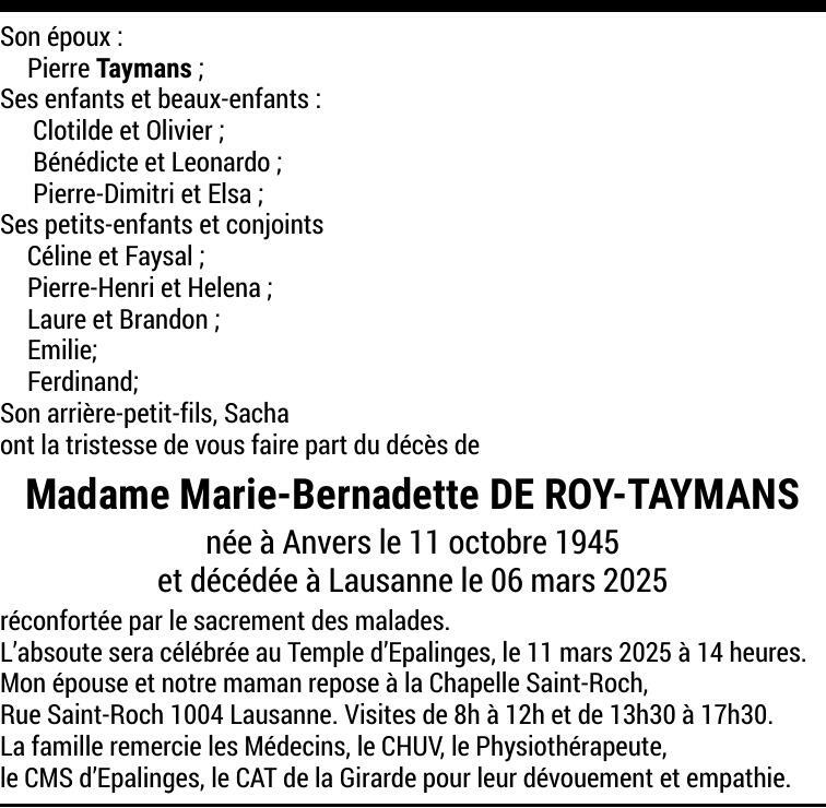 Madame Marie-Bernadette DE ROY-TAYMANS 11 oct. 1945 - 06 mar. 2025 Avis mortuaire PFG Partager sur: Galerie
