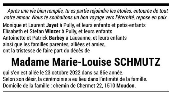 Madame Marie-Louise SCHMUTZ 16 jan. 1936 - 23 oct. 2022 Avis mortuaire PFG Télecharger PDF Partager sur: Galerie