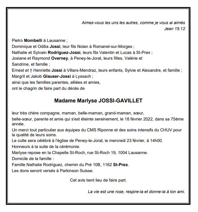 Madame Marlyse JOSSI-GAVILLET 24 déc. 1947 - 18 fév. 2022 Avis mortuaire PFG Télecharger PDF Partager sur: Galerie PreviousNext PreviousNext