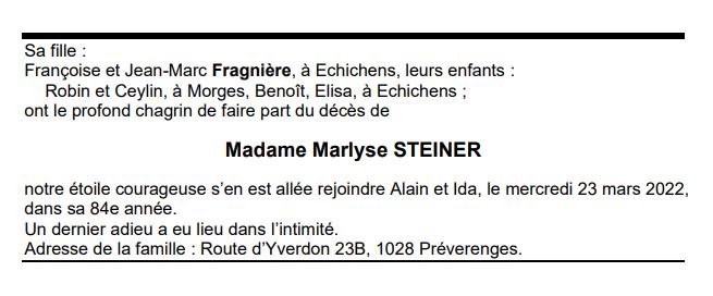 Madame Marlyse STEINER 14 juil. 1939 - 23 mar. 2022 Avis mortuaire PFG Télecharger PDF Partager sur: Galerie PreviousNext PreviousNext