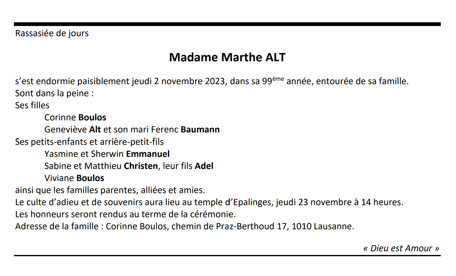 Madame Marthe ALT 02 oct. 1925 - 02 nov. 2023 Avis mortuaire PFG Télecharger PDF Partager sur: Galerie PreviousNext PreviousNext