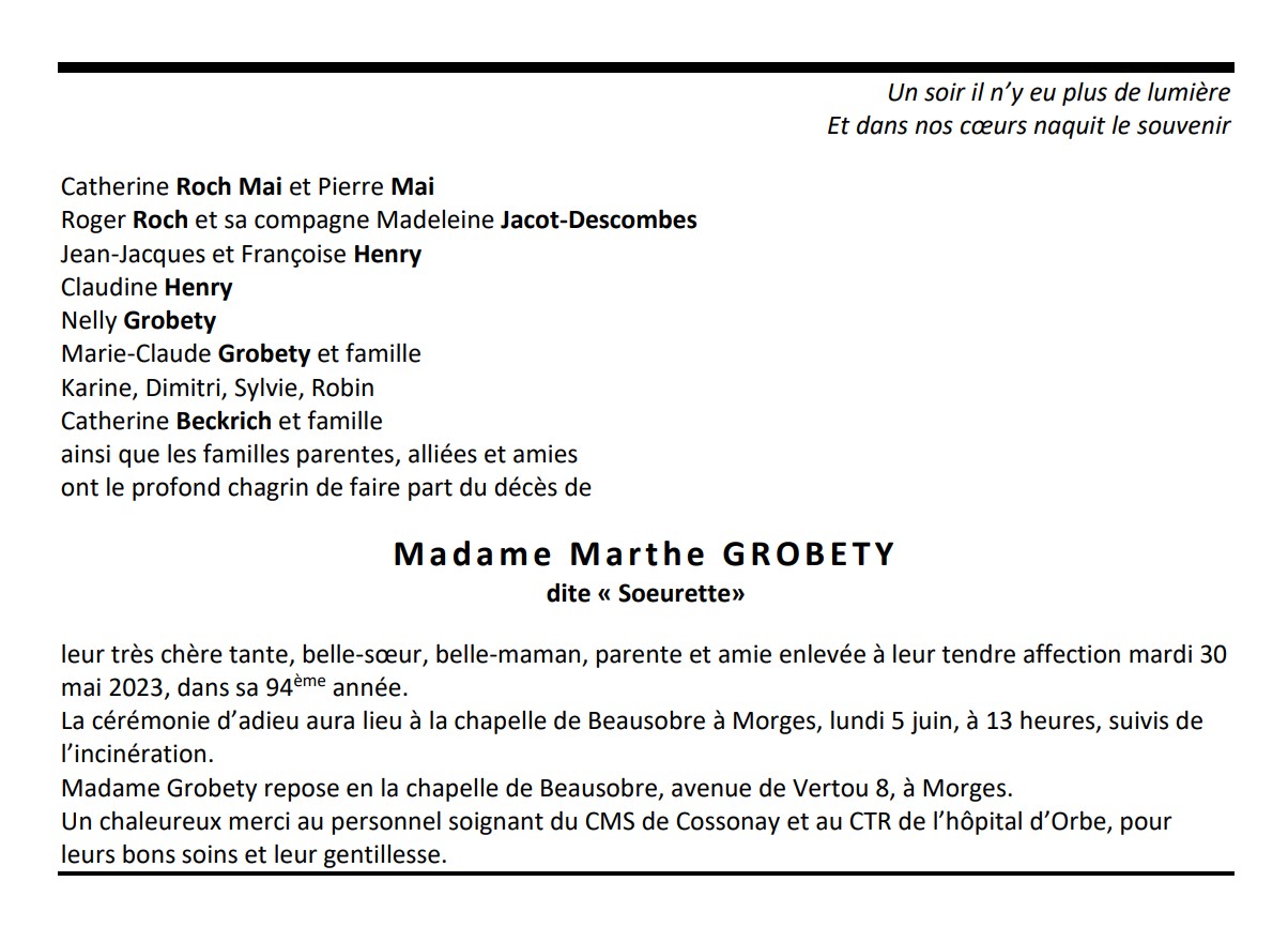 Madame Marthe GROBETY dite « Soeurette» 16 aoû. 1929 - 30 mai. 2023 Avis mortuaire PFG Télecharger PDF Partager sur: Galerie PreviousNext PreviousNext