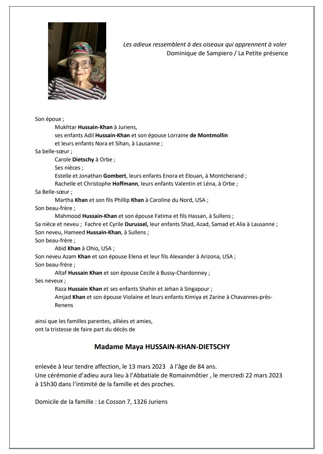 Madame Maya HUSSAIN-KHAN-DIETSCHY 13 mar. 2023 Avis mortuaire PFG Télecharger PDF Partager sur: Galerie PreviousNext PreviousNext