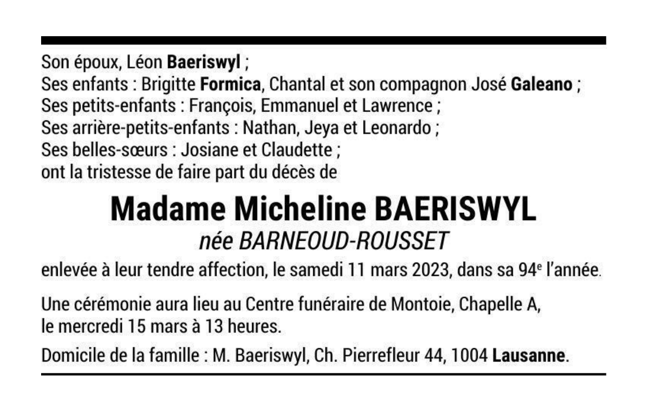 Madame Micheline BAERISWYL née BARNEOUD-ROUSSET 26 juil. 1929 - 11 mar. 2023 Avis mortuaire PFG Télecharger PDF Partager sur: Galerie PreviousNext PreviousNext