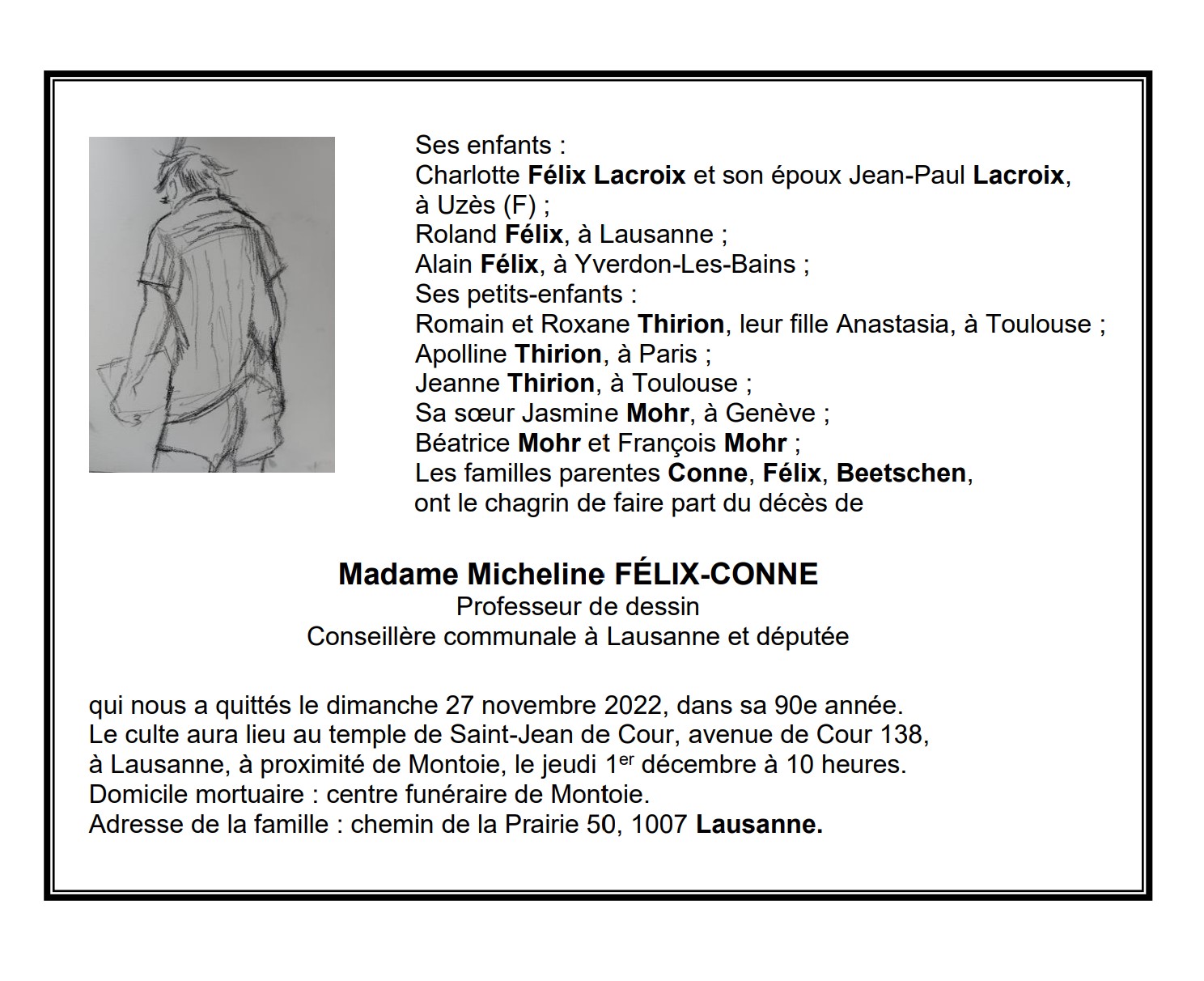 Madame Micheline FÉLIX-CONNE 26 avr. 1933 - 27 nov. 2022 Avis mortuaire PFG Télecharger PDF Partager sur: Galerie PreviousNext PreviousNext