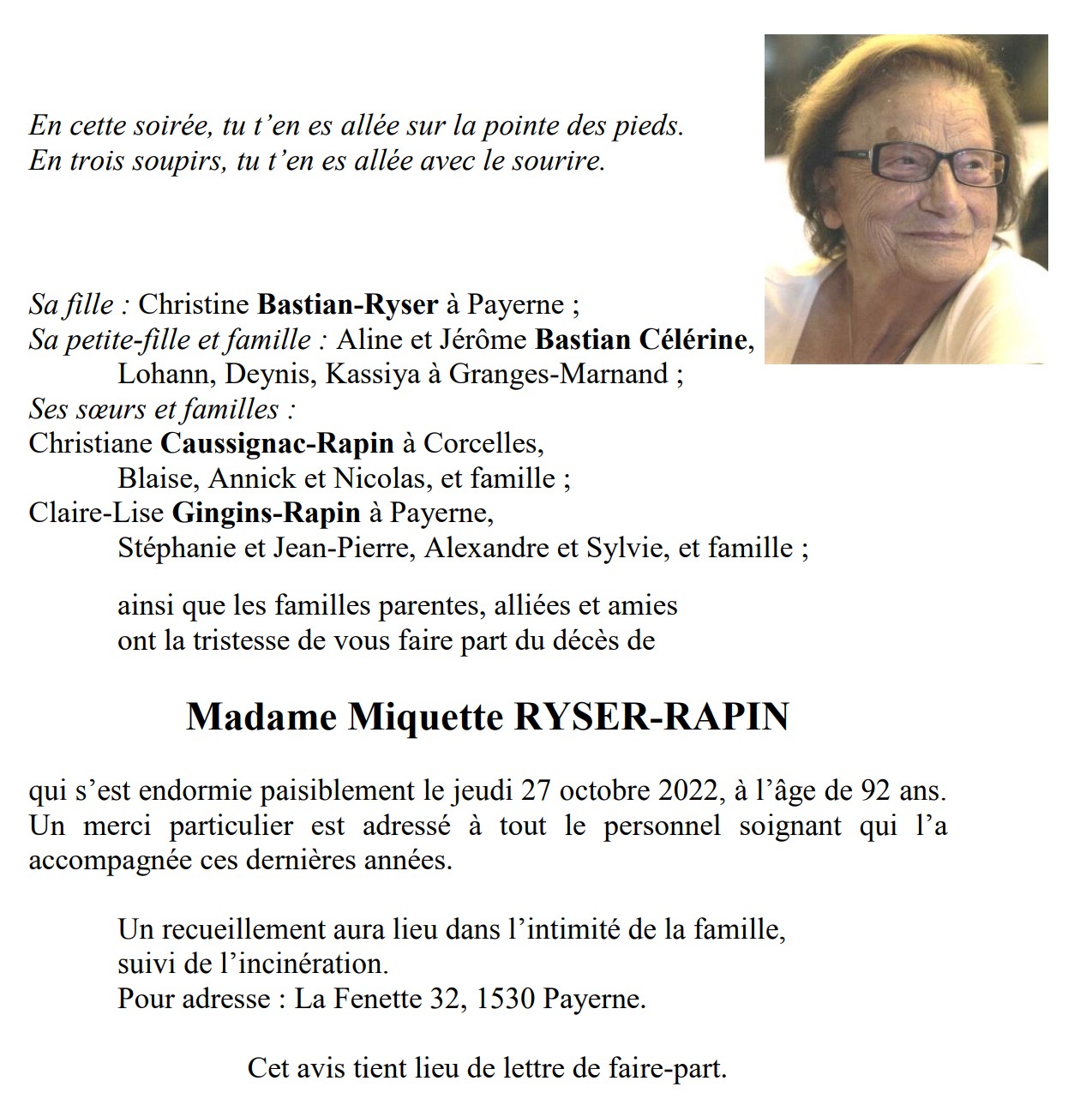 Madame Miquette RYSER-RAPIN 09 mai. 1930 - 27 oct. 2022 Avis mortuaire PFG Télecharger PDF Partager sur: Galerie