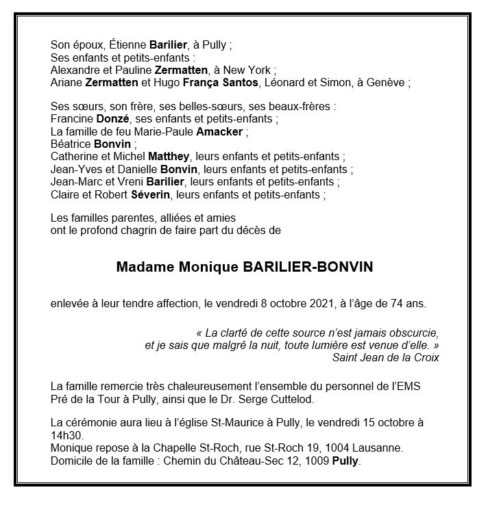 Madame Monique BARILIER-BONVIN 19 mai. 1947 - 08 oct. 2021 Avis mortuaire PFG Télecharger PDF Partager sur: Galerie PreviousNext PreviousNext