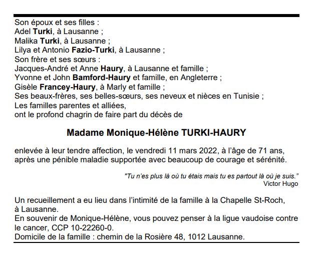Madame Monique-Hélène TURKI-HAURY 20 sep. 1950 - 11 mar. 2022 Avis mortuaire PFG Télecharger PDF Partager sur: Galerie PreviousNext PreviousNext