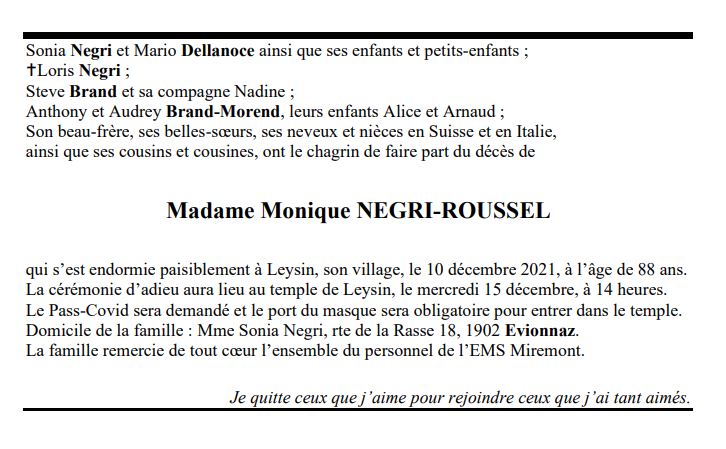 Madame Monique NEGRI-ROUSSEL 18 nov. 1933 - 10 déc. 2021 Avis mortuaire PFG Télecharger PDF Partager sur: Galerie PreviousNext PreviousNext