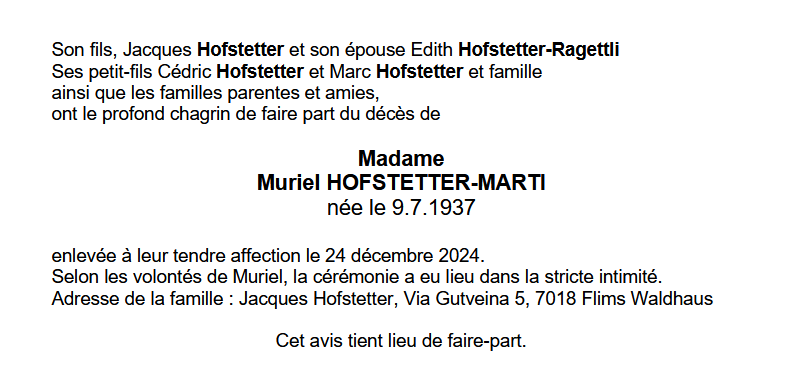 Madame Muriel HOFSTETTER-MARTI 09 juil. 1937 - 24 déc. 2024 Avis mortuaire PFG Télecharger PDF Partager sur: Galerie