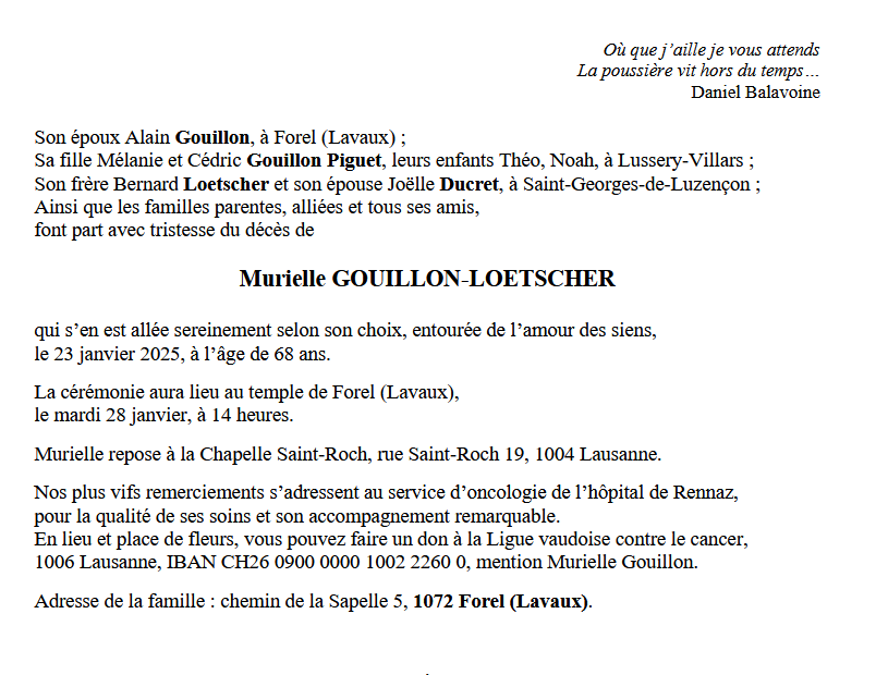 Madame Murielle GOUILLON-LOETSCHER 08 avr. 1956 - 23 jan. 2025 Avis mortuaire PFG Télecharger PDF Partager sur: Galerie