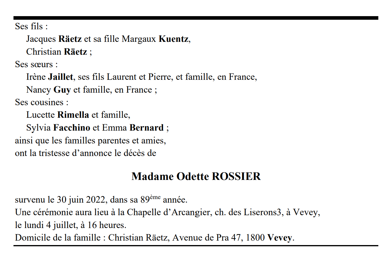 Madame Odette ROSSIER 11 aoû. 1933 - 30 juin. 2022 Avis mortuaire PFG Télecharger PDF Partager sur: Galerie PreviousNext PreviousNext