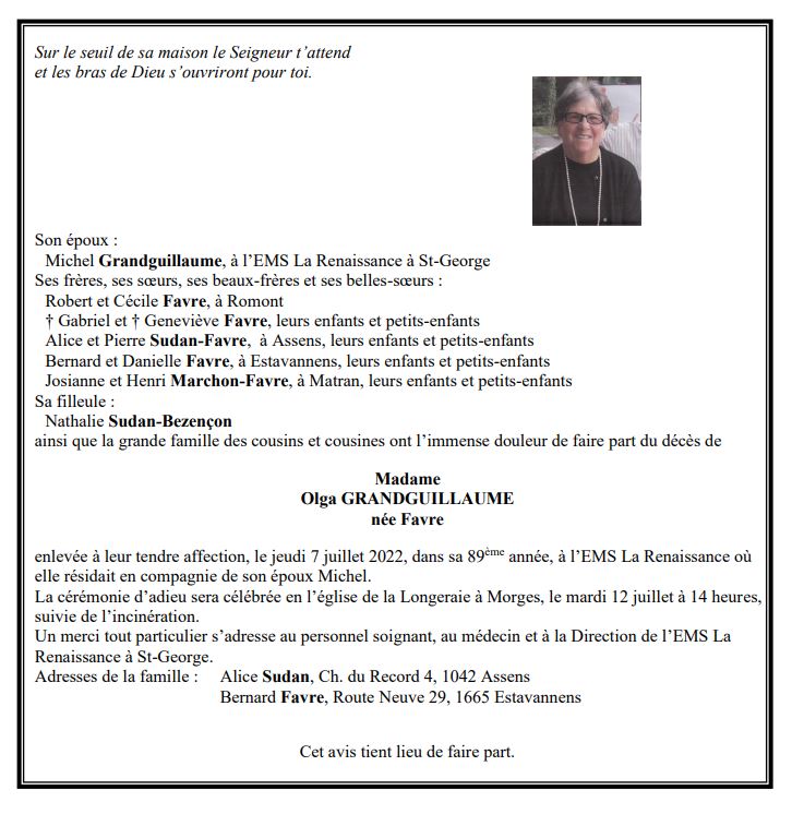 Madame Olga GRANDGUILLAUME 13 fév. 1934 - 07 juil. 2022 Avis mortuaire PFG Télecharger PDF Partager sur: Galerie PreviousNext PreviousNext