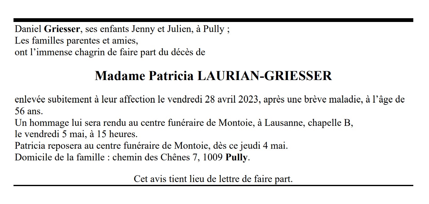 Madame Patricia LAURIAN-GRIESSER 07 mar. 1967 - 28 avr. 2023 Avis mortuaire PFG Télecharger PDF Partager sur: Galerie PreviousNext PreviousNext