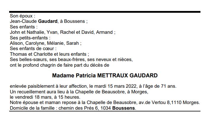 Madame Patricia METTRAUX GAUDARD 17 nov. 1950 - 15 mar. 2022 Avis mortuaire PFG Télecharger PDF Partager sur: Galerie PreviousNext PreviousNext