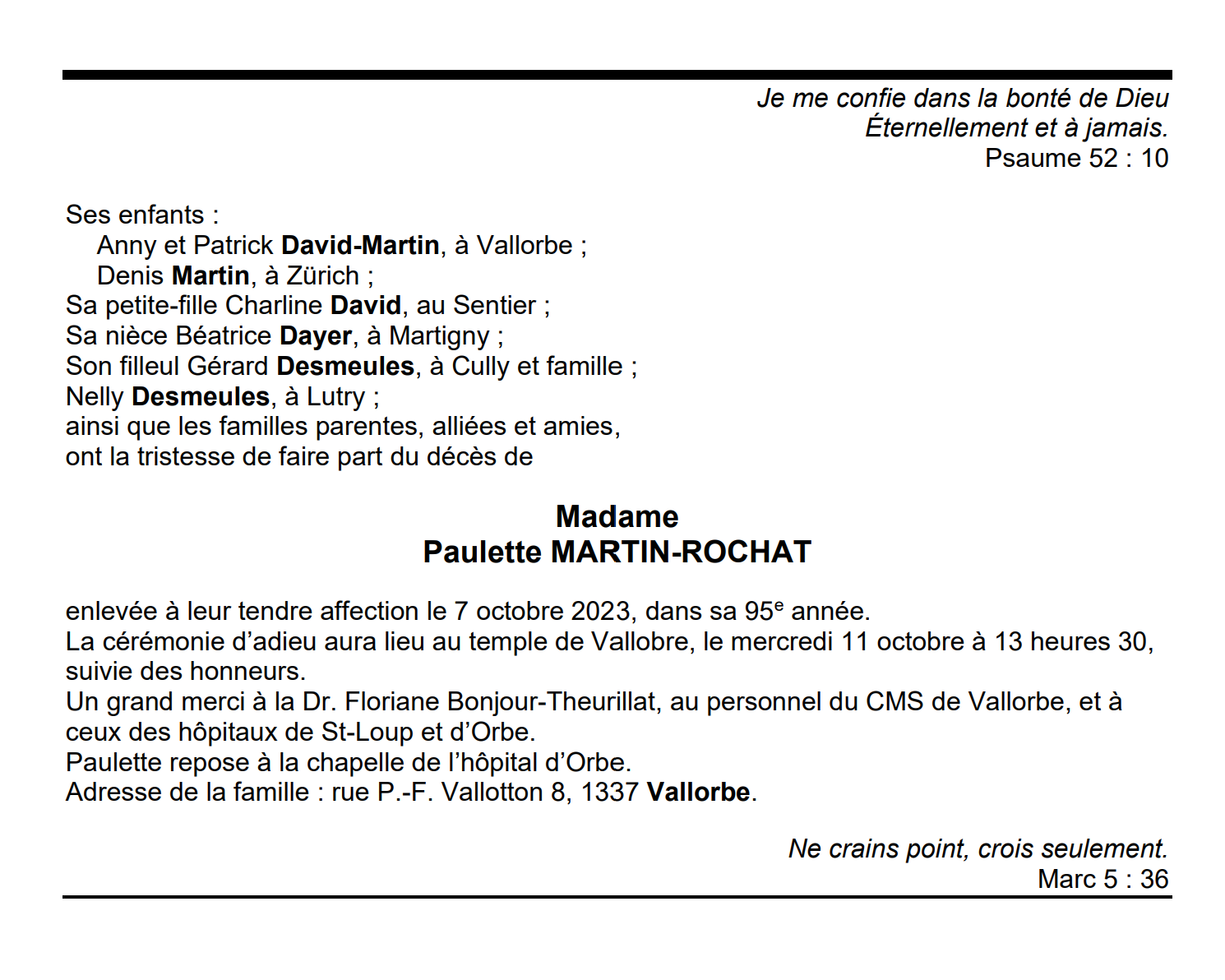 Madame Paulette MARTIN-ROCHAT 28 aoû. 1929 - 07 oct. 2023 Avis mortuaire PFG Télecharger PDF Partager sur: Galerie