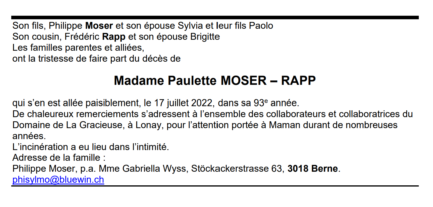 Madame Paulette MOSER – RAPP 14 fév. 1930 - 17 juil. 2022 Avis mortuaire PFG Télecharger PDF Partager sur: Galerie PreviousNext PreviousNext