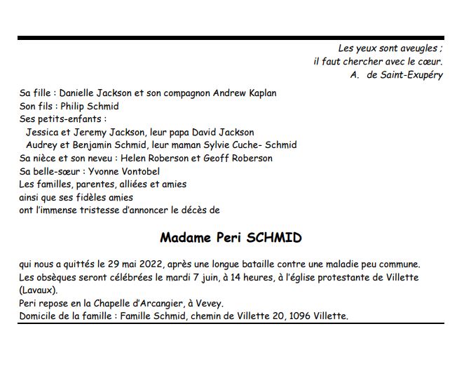Madame Peri SCHMID 28 mar. 1933 - 29 mai. 2022 Avis mortuaire PFG Télecharger PDF Partager sur: Galerie PreviousNext PreviousNext