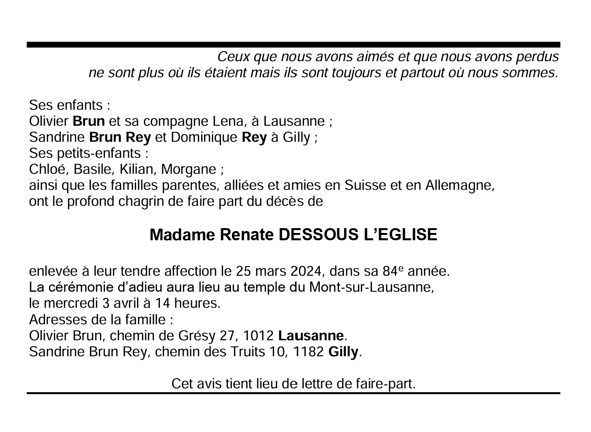 Madame Renate DESSOUS L’EGLISE 31 mar. 1940 - 25 mar. 2024 Avis mortuaire PFG Télecharger PDF Partager sur: Galerie PreviousNext PreviousNext
