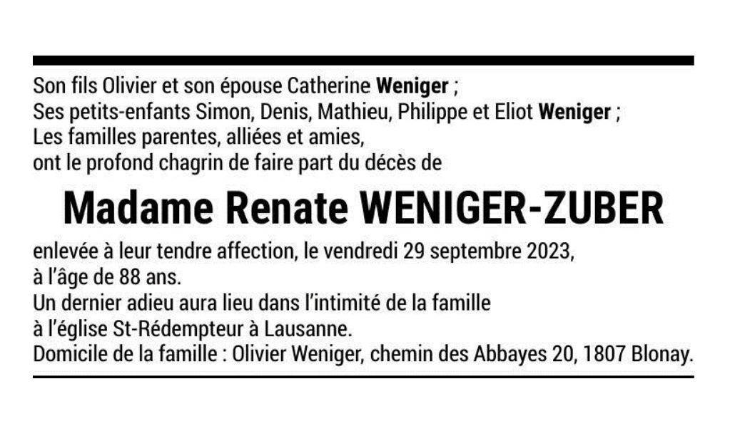 Madame Renate WENIGER-ZUBER 12 nov. 1934 - 29 sep. 2023 Avis mortuaire PFG Télecharger PDF Partager sur: Galerie PreviousNext PreviousNext