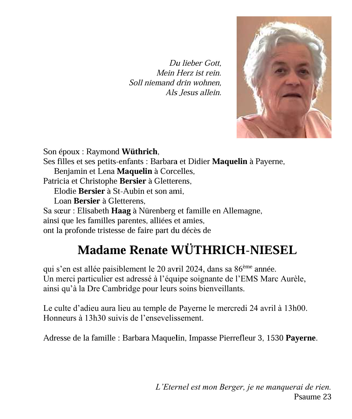 Madame Renate WÜTHRICH-NIESEL 14 mai. 1938 - 20 avr. 2024 Avis mortuaire PFG Télecharger PDF Partager sur: Galerie PreviousNext PreviousNext