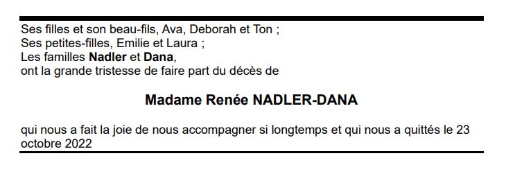 Madame Renée NADLER-DANA 25 oct. 2022 - 23 oct. 2022 Avis mortuaire PFG Télecharger PDF Partager sur: Galerie PreviousNext PreviousNext