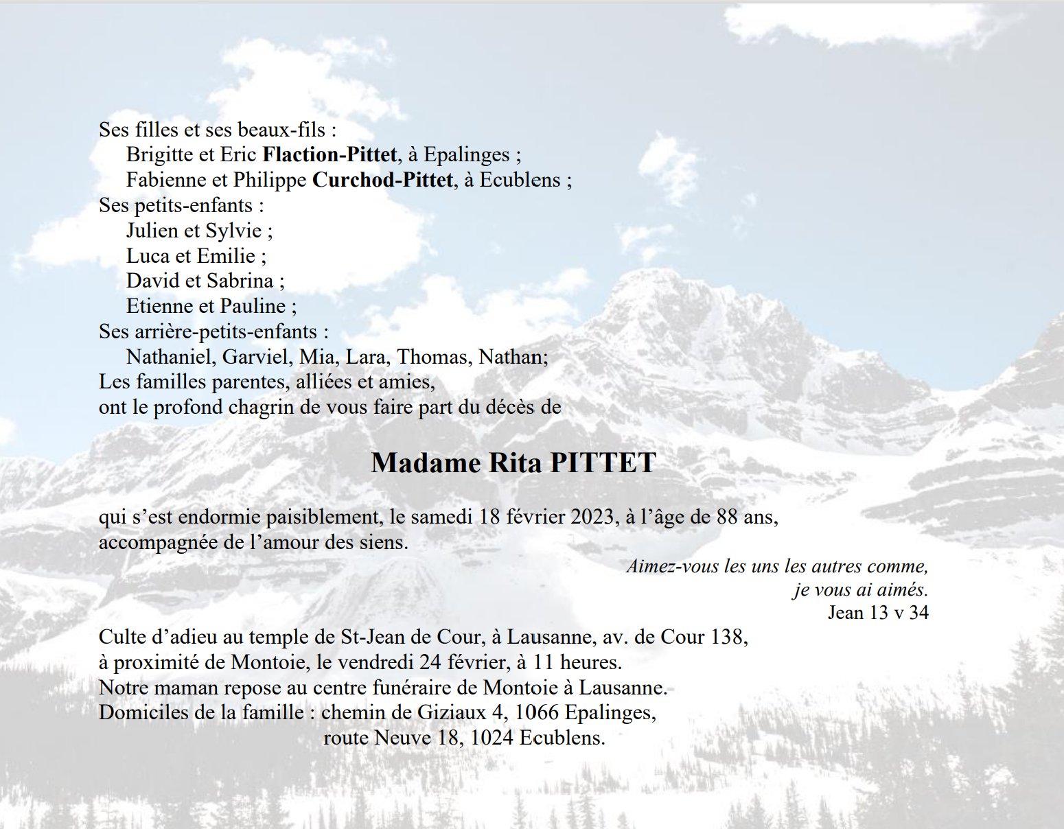 Madame Rita PITTET 29 juil. 1935 - 18 fév. 2023 Avis mortuaire PFG Télecharger PDF Partager sur: Galerie PreviousNext PreviousNext