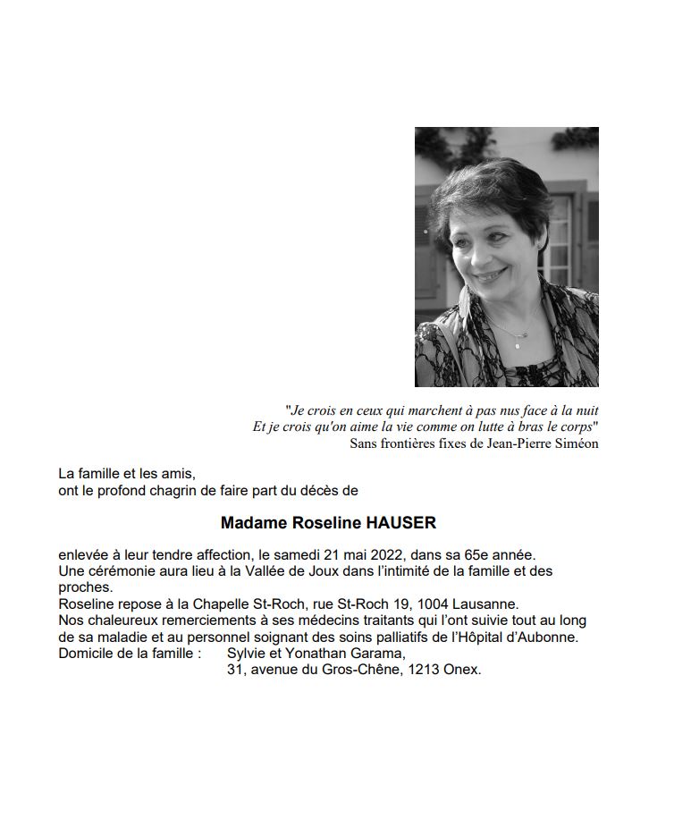 Madame Roseline HAUSER 07 aoû. 1957 - 21 mai. 2022 Avis mortuaire PFG Télecharger PDF Partager sur: Galerie PreviousNext PreviousNext
