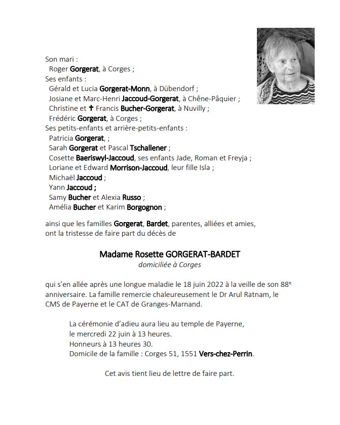 Madame Rosette GORGERAT-BARDET 01 juil. 1934 - 18 juin. 2022 Avis mortuaire PFG Télecharger PDF Partager sur: Galerie PreviousNext PreviousNext