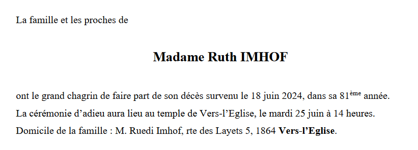 Madame Ruth IMHOF 31 oct. 1943 - 18 juin. 2024 Avis mortuaire PFG Télecharger PDF Partager sur: Galerie PreviousNext PreviousNext