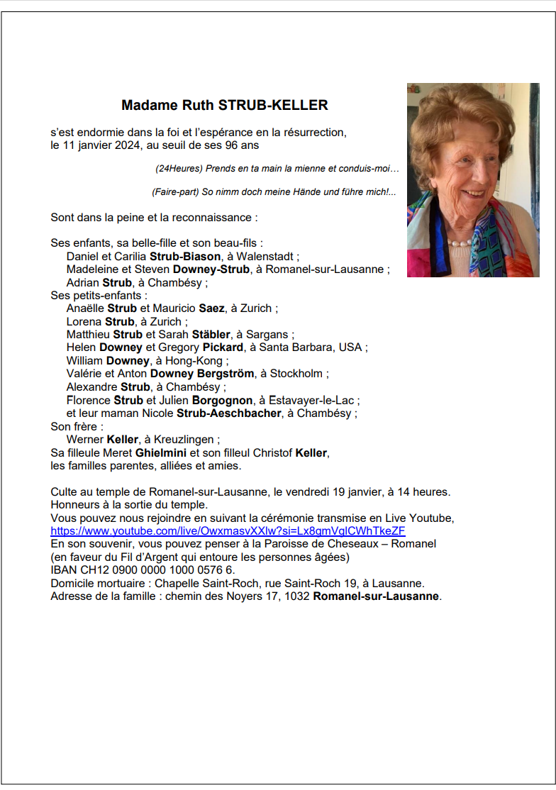 Madame Ruth STRUB-KELLER 04 mar. 1928 - 11 jan. 2024 Avis mortuaire PFG Télecharger PDF Partager sur: Galerie PreviousNext PreviousNext