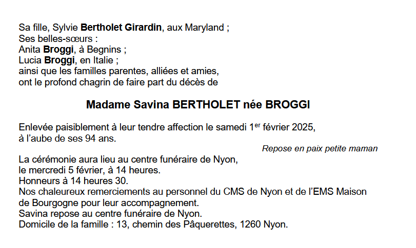 Madame Savina BERTHOLET 16 fév. 1931 - 01 fév. 2025 Avis mortuaire PFG Télecharger PDF Partager sur: Galerie