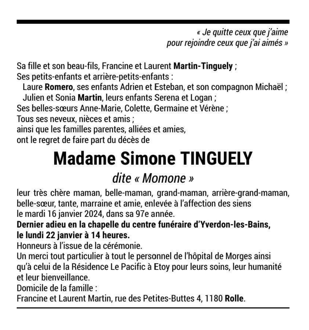 Madame Simone TINGUELY dite « Momone » 11 mar. 1927 - 16 jan. 2024 Avis mortuaire PFG Télecharger PDF Partager sur: Galerie PreviousNext PreviousNext
